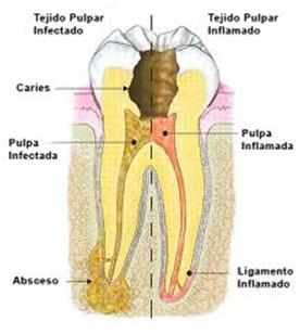 - Procesos Inflamatorios (Pulpitis): en los cuales, la pulpa dental se inflama y debido a que se encuentra encerrada dentro del canal radicular de paredes inextensibles provoca DOLOR dentario. Las pulpitis pueden ser causadas por caries, por traumatismos, en respuesta a la acción térmica del fresado o a ciertos materiales utilizados durante la limpieza o la restauración de las piezas dentales, etc.