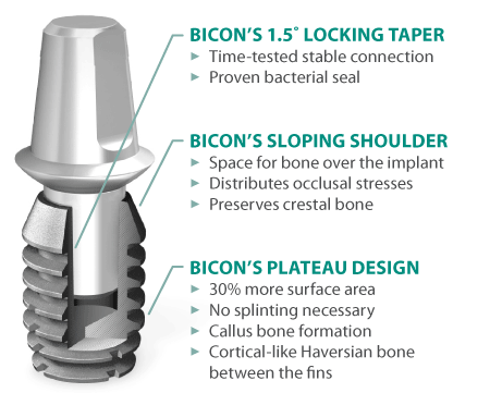 El IMPLANTE BICON fue diseñado para restaurar la dentición sin utilizar tornillos. Por esta razón , los médicos , técnicos, y los pacientes no experimentan las limitaciones y frustraciones inherentes al uso de tornillos.